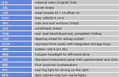 X4C = National sales program Italy 1AC = Anti-lock brake system (ABS) 3FK = Slide/tilt sunroof with sunblind 5J1 = Rear spoiler C8E = Steel wheels 6J x 14 Offset 43 H2Y = Tires 185/55 R14 H 4KC = Side and rear windows in heat-insulatingglass 4GF = Windshield in heat-insulating glass 3NB = Rear seat bench/backrest, completely folding 1MZ = Steering wheel for air bag system Q1W = Standard front seats with integrated storage trays J0A = Battery 175 A (36 Ah) 8BB = Halogen headlight for driving on the right U1L = Instrument insert w/ km/h speedometer, clock, tachometer and special color trim 8RE = 4 speakers (passive) 8TC = Rear fog light for driving on the right 8F2 = Side turn signal lights