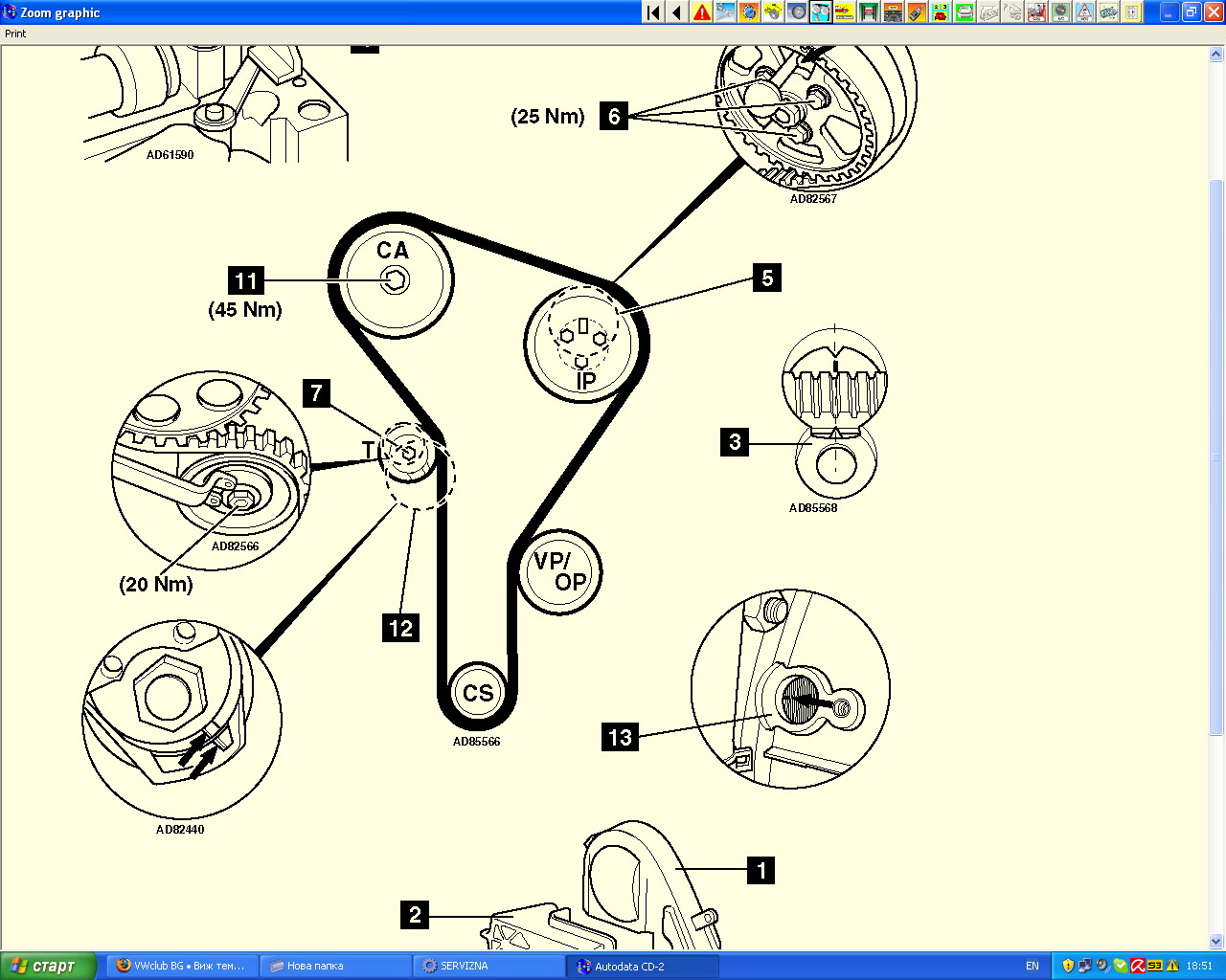 van4ooo написа:Трябва да докараш на белег коляновия вал и помпата сваляш капака на клапаните застопоряваш разпределителния вал както е показано-разхлабваш му зъбното колело да може да се движи обтягаш ремъка и тогава стягаш колелото.