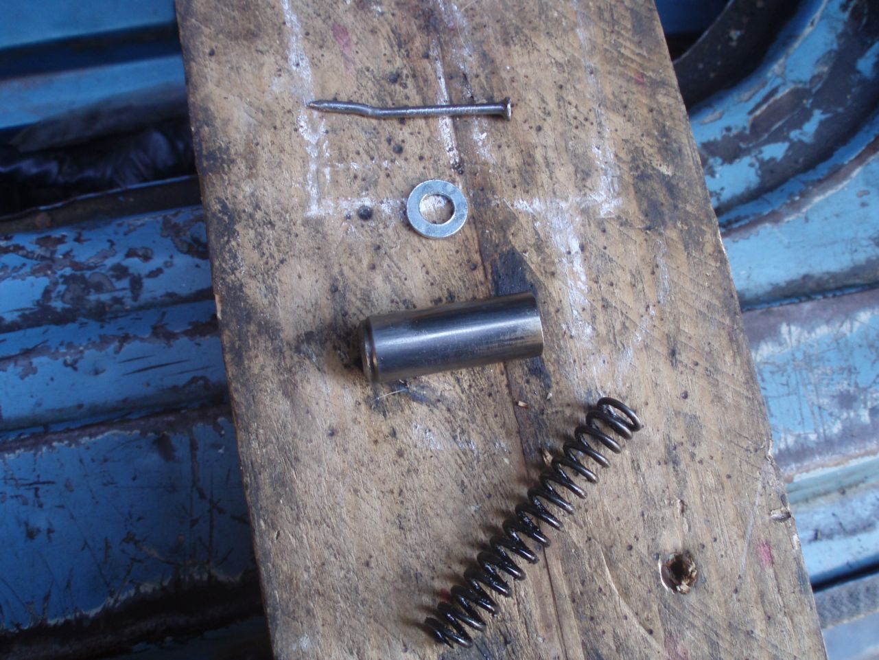Както и да е....Ето малко снимки които обещах:Рязаната пружина:Пълния комплект на "майстора на помпата"начин на определяне на налягането.Ако искаш по високо,преместваш пирона на друга дупка.