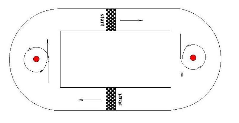 Стартират по два автомобила едновременно, на две старт-финални линии с дистанция 1/2 от дължината на трасето.