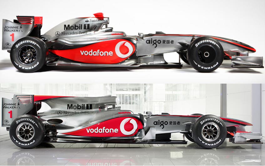 Всъщност пак е чесане на езици де... има доста визуална измама благодарение на цветовите схеми и лепенките. Дори сайтовете, които предоставят съпоставителни снимки на болиди предупреждават, че заради различен ъгъл, зуум и подход към снимките тези сравнения не са много меродавни, въпреки дигиталното приравняване по размера на задните гуми. Добър пример е Рено - твърдят, че новата кола е 250 мм по-дълга от миналогодишната, а на сравнителните снимки разликата е около 50 мм.