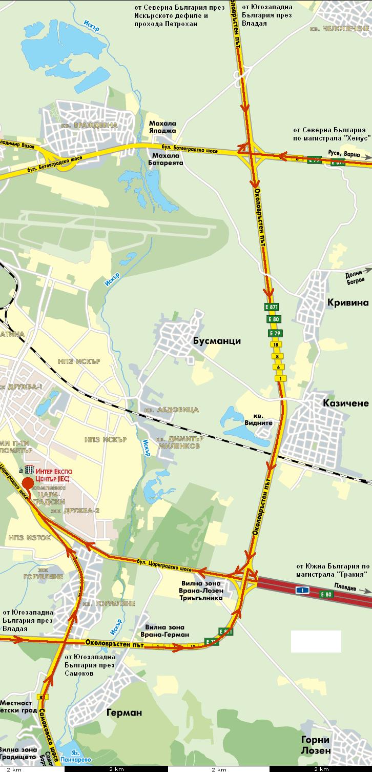 Направил съм и една примерна карта за най-лесния достъп до Интер Експо Център за хората, които идват извън София. На съответните подстъпи съм отбелязал от къде се идва, а има и стрелки за посоката на движение.