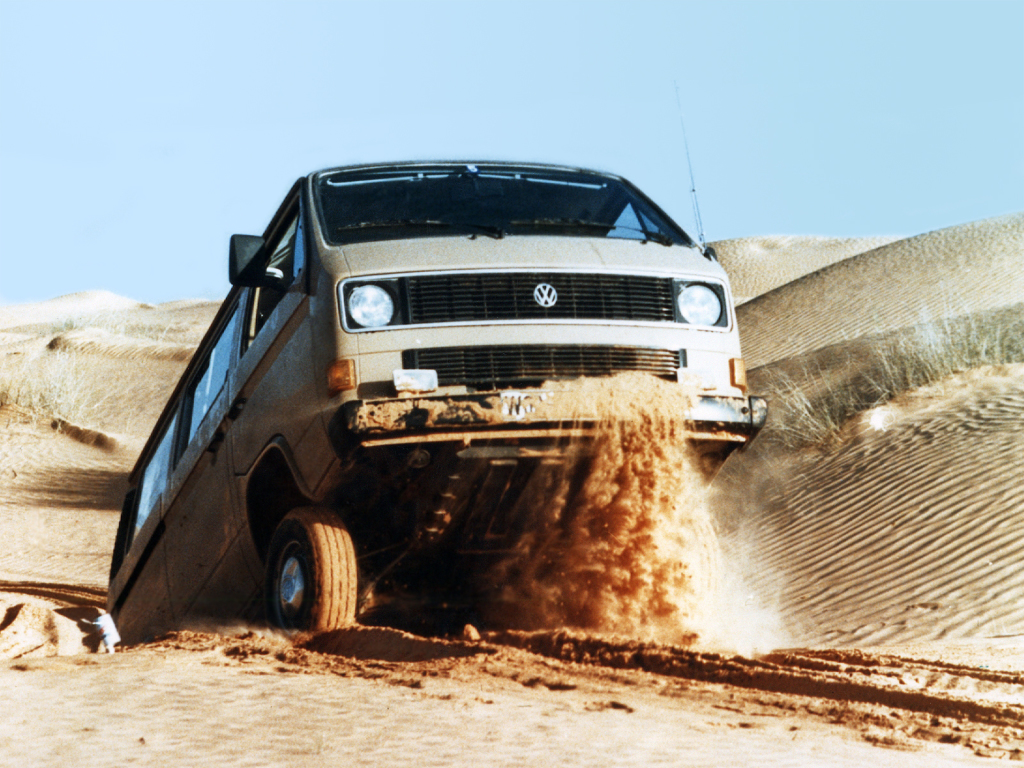 Първите модели на VW с 4 задвижващи колела са: Тип 86 "Kommanderwagen" & Тип 128 "Schwimmwagens" по време на Втората световна война. Изминаха близо 40 години, преди VW да се решат отново да помислят за пълноприводен автомобил. През 1970г. няколко инженера от Фолксваген, които обичали да пътуват със своите кемпери T2 Westfalia из цяла Европа и Африка (която се е славила с негостоприемните си райони) решили, че е добра идея да направят пълноприводен бус, където конкуренцията на пазара в този момент била много слаба. Ръководители на проекта са Густав Майер и Хенрих Дъкстейн. В онези времена е било трудно да се преборят за финансиране, но успели да произведат пет прототипа за тестване. Идеята била, ако успеят да произведат сполучлив модел 4х4, който да се докаже в трудния африкански ландшафт, то така ще успеят да привлекат поръчки от военните. Първият от петте прототипа е завършен в края на 1975г. Използва се полу-автоматична скоростна кутия "Stick Shift". Тя е била куплирана с преобразувател на въртящия момент (раздатка?!) и хидравличен съединител, който е бил разработен за военния Iltis. Двигателя е бил класическия 4-цилиндров боксер 2000 cc. 70 к.с. с въздушно охлаждане. Буса е бил оборудван с два блокажа и механична муфа, с която е зацепван предния мост. Спирачките са били барабанни, а ауспуха е модифициран и изведен през задната броня, за да не се намаля клиренса на автомобила. Първата експериментална версия на Transporter със задвижване на всички колела е тествана през 1978 г. в алжирската част на пустинята Сахара.