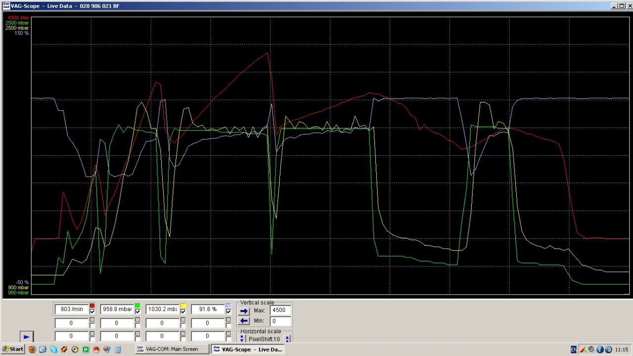 Нов дебитомер на същия двигател веднага отстранява проблема. Мощността се връща, исканите и актуалните стойности на дебитомера са еднакви отново.Вече при 3000 оборота при WOT стойностите са 850 мг./удар. Както може да се види, актуалните и исканите стойности не са винаги точно еднакви. Това е нормално. Графиката по-долу е от двигател AHF двигател ( със същия дебитомер като на AFN двигател ).При пълно ускорение от първа до четвърта скорост. Смяната на скоростите се извършва при 47-та,53-тата и 60-тата секунда. Исканите стойности са 850мг./удар при 3000 оборота. Актуалните стойности също са 850мг./удар : Това означава, че дебитомера е работещ.