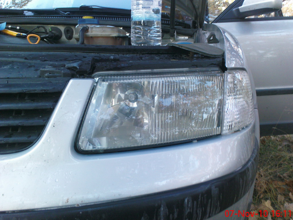 Свалих фаровете след което забелязах че щипките са счупени и затова свалих стъклото (пласмасата) с телоподаващо и малко творчество и около 3 часа нагласихме рефлекторите за да може да се движът и регулират а не както бе преди това, наблъскан стериопор за да се регулира фара.