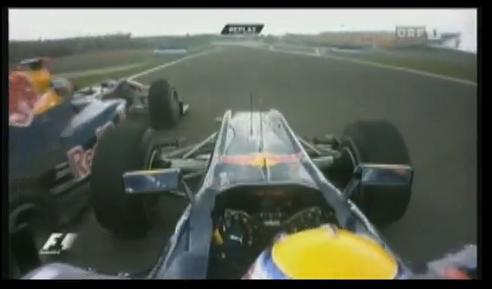 гледайте от камерата на фетел, вижте къде кара той преди да мине в дясно - почти на бялата линия в края на пистата... в същото време Уебър се движи в средата на трасето, имайки свободна половин писта в дясно... е защо наближавайки левия завой и изпреварен с половин кола продължи да притиска съотборника си ?! даже се вижда как момент преди да се допрат гумите той вече прави корекции с волана за спирането преди завоя, но защо не го направи по-рано - нарочно, за да притисне Фетел максимално...