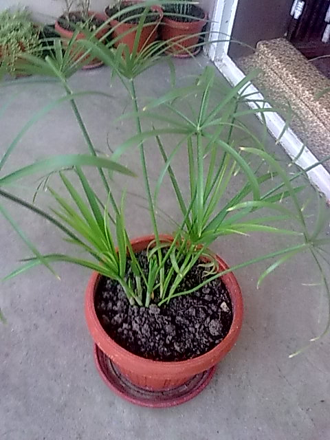 Това е водна палма, или поне така му викат. Имам такова. Специфичното за него е, че се полива в чинийката, а не в саксията директно.