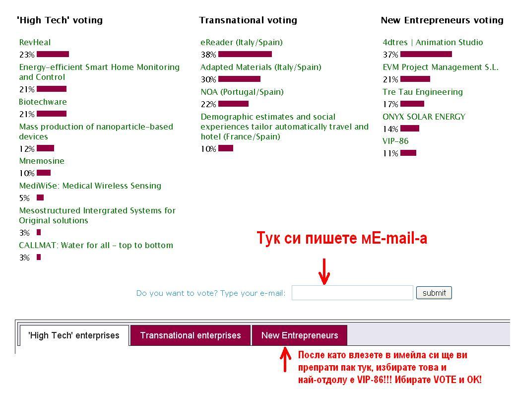 Като отворите линка си пишете мейла долу в полето! Ще ви пратят линк за да гласувате, избирате отдолу дясната от трите подкатегории и най-отдолу е моята фирма- VIP-86.
