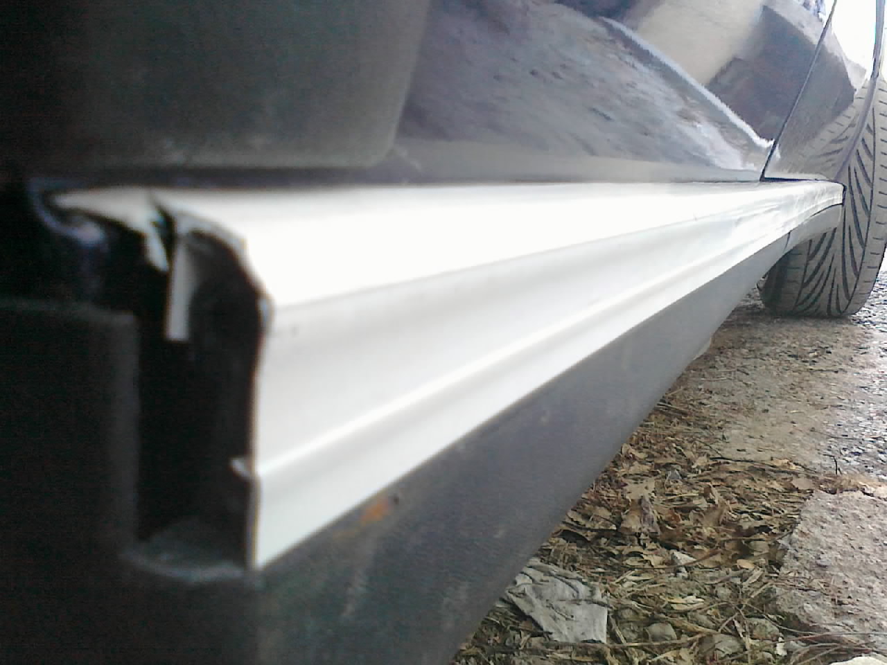 Слева последно мерене,доизраязване,щкурене на рязания ръб,който ще се вижда,боядисване:в моя случай-спрей за брони на "Боди"и монтиране на лаистната на самия праг.Според мен по лесниият вариянт е след хубаво почистване с водоструйка на целия праг,лайстната да се плъзга по канала откъм задната гума до предната капачка на калника.