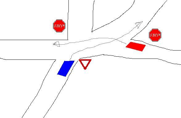 На картинката червената е с предимство. Само че тук кръстовището е Х-образно. Докато даденото в първия пост даже не съм сигурен, че е едно кръстовище. По-скоро може би са две едно след друго. Там не вярвам на случаен принцип да е сложен знакът СТОП.