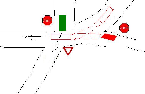 По твоята логика би следвало зелената кола да е с предимство, нали така? Хайде при катастрофа докажи къде се е движила червената? Може да е била по пътя с предимство, може и да не е била там. Червения шофер ако каже, че е бил по пътя с предимство и няма спирачен път по асфалта преди да го удариш не виждам ако нямаш свидетели как ще докажеш, че оня е крив...