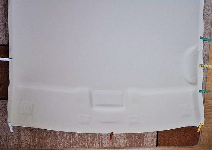След това изчистих хубаво цялата плоскост с керосилин, за да махна остатъците от старото лепило и дунапрен, след което намазах с лепилото предната половина на тавана, сложих дамаската и с валячето от средата към крайщата започнах да притискам тапицерията към тавана, като специално внимание се обръща на дупките и оребренията.