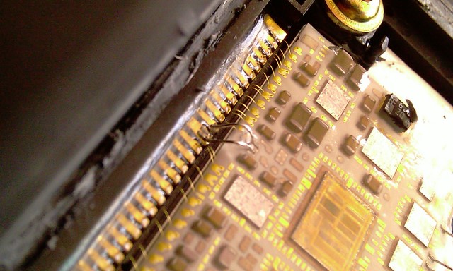 Понеже гледах как ми запояват блока, мога да кажа, че реалния проблем беше една подобна на желе изолация поставена вършу цялата платака! Много трудно се отстранява, пречи и не позволява да хване спойката!!! Като прибавим, към това и финната спойка, малките размери на на жичките и внимаването да не се увредят другиспойки или чипове по платката си става цяло приключение! Оказва се, че тези жички, които всъчщност се разпояват служат за маса и е възможно да се вземе такава от другаде, за да стане по-добре цялата процедура