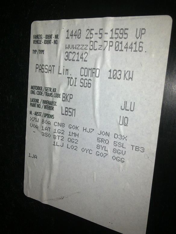 Представлява стикер. Обикновено е в легена на резервната гума или в близост до левия стоп... Всеки код обозначава дадена опция за колата.