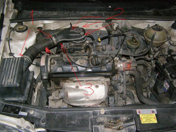 За да не се сваля филтърната кутия се откача едната от скобите '1' , развиват се 3-те по-дълги болтчета '2' /ако запекат в леглата си може и да ги понапънете / , след това се откача маркуча на картерната вентилация , който влиза в моното '3' /няма скоби там / . Като махнеш 'тавата' ще видиш дюзата