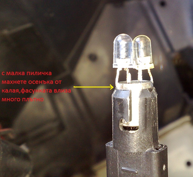 не изхвърляйте старите изгурели крушки: чупя стъклото и с нещо остро изтъргвам добре отвътре има нещо като слюда с поялник почиствам отзад калая докато се отвори дупка от там си озкарвам крачетата на съпротивленията за диодите аз лично съм с отделно за всеки диод за тях запоявам +са минус го хващам за пириферията на фасунката и не се оливайте с калая фасубката влиза много плътно