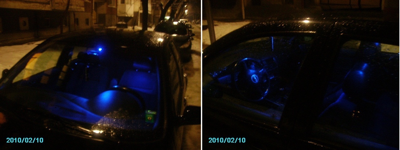 2. Прекъснах връзката на тези крачета, за да не светят при отваряне на вратата крайните крушки, които са с ярки бели диоди, а само в средата, където сложих две паралелно вързани диодни крушки с по два сини диода(общо четири) в корпус на сулфидна крушка. Направи ми впечатление, че сините крушки както на предния, така и на задните плафони след изгасяне продължават едва доловимо да мъждукат, но толкова слабо, че се забелязва само през нощта. Реших, че се дължи на някой кондензатор по веригата, но когато вързах и гореспоменатото мини прожекторче, то след изгасяне не просто мъждукаше,а направо продължаваше да си свети, но по-слабо.