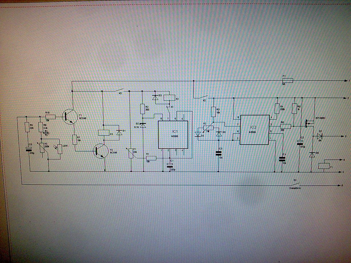 Няма нужда от цяло фото реле, само един LDR-фото резистор ще свъши работа свързан паралелно на R4.Когато е светло съпротивлението му е около 500 Ом и ще разрежда кондензатора много бързо а когато е тъмно 10 МОм времезадаващата група ще си работи нормално. Ще се опитам да начертая цялата схема но незнам дали ще ми се получи чертането не ми се одава