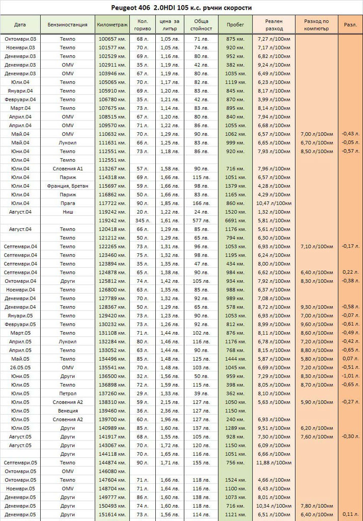 - За Пежо 406 2.0HDI 104 к.с. ръчни скорости: 7.5/4.5/5.6
