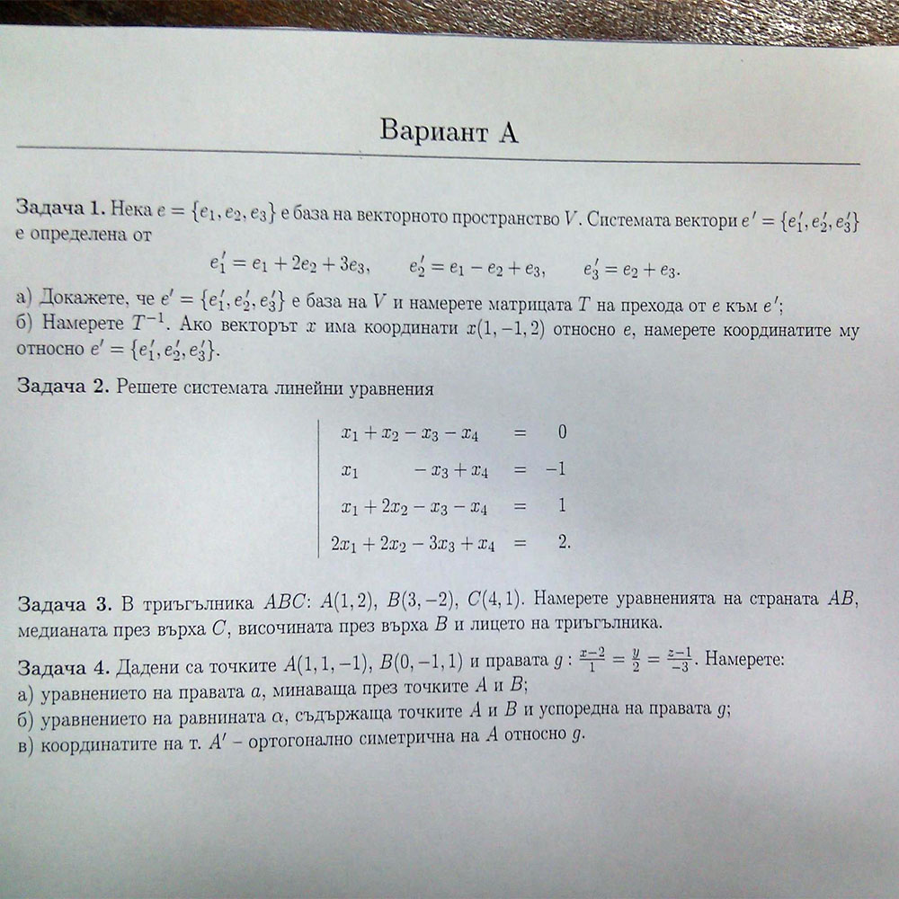 Здравейте колеги ! Проблема е следния. Утре имам изпит по Линейна алгебра и аналитична геометрия. Тая математика никога не съм я знаел и разбирал. Има ли някой който може да помогне ?