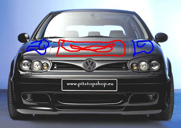 Имам Голф 4 с оригинални фарове(не BORA LOOK)При него капакът има следната извивка като се гледа отпред: червената част е по-ниско от синята: