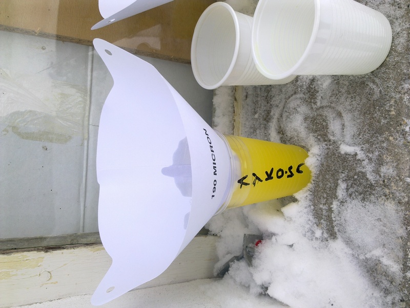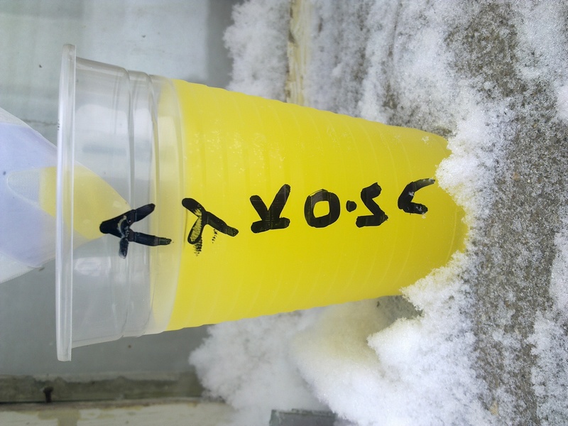 Малко продължение на експеримента .Предварително подготвих пластмасови чашки и на всяка сложих "бояджийски" филтър 190 микрона.Извадих пробите от фризера ,разклатих всяка една бутилка и напълних по 100 мл в отделни чашки .След това в разстояние на около 4-5 секунди ги излях в съответния филтър .Снимки: Изваждане на пробите от фризера: