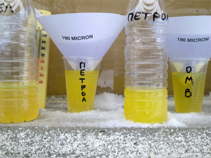 Снимки и на филтрите :Лукойл Ромпетрол Шел Петрол ОМВ Както преди ,така и сега да спомена ,че експериментът който провеждам е любителски и не претендира за точност!!Важно е да се каже ,че условията и пособията които се използват (съдове,термометри,фризери,фотоапарати и др.) също са далеч и нямат нищо общо със и от лабораторни и са любителски-подчертавам!!Така,че ако някой има претенции към изпълнението и точността-ще е прав!!При изпълнението не съм проявявал пристрастие !!Моля засегнатите страни да го имат в предвид гореизложеното.По -напред в темата също има снимки и на касовите бележки ,на тях е описано и вида на горивата.Успех и безаварийно каране