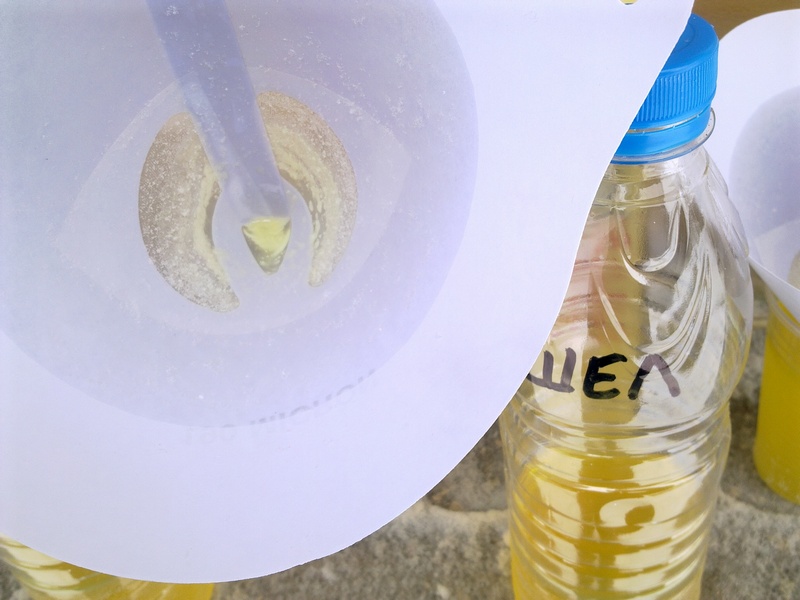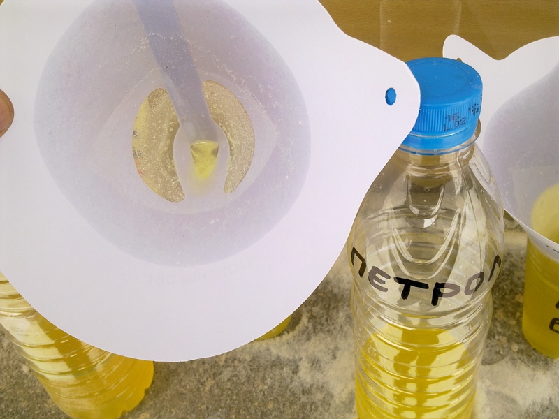 Браво колега за експеримента!!! Доколкото виждам Шел и Петрол са най-мътни, останалите са ок, като Ромпетрол е най-бистра. Как си действал с фунията, през нея наливаш в чашата нали така?