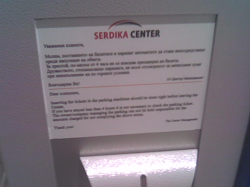 Та отивам аз в 11:44 това е часът отбелязан на билета.Билет на който с големи букви пише 4 часа безплатен паркинг. Взимам си билета стигам до асансьора и там някаква машина в която си пъхат билетите, вече разбрах, че е била за проверка на билета преди да излезеш. Съответно ако си преминал четирите часа във тази машина си заплащаш престоя. Та и аз си пъхнах билетчето там още на влизане. В друг мол трябваше да си го пъхнеш за да важи вместо за един час за три (примерно, не помня точно какво беше времето). Та тръгвам да излизам часът е 13;50. Пъхам билетчето на бариерата, но ми пише, че трябва да си заплата такса за престой. Връщам се пак на машината пъхам билета и излиза, че трябва да заплатя 7 лв за престоя ми в мола при положение, че престой до 4 часа е БЕЗПЛАТЕН. Качих се на трети етаж, там е нещо като офис на паркинга, за да попитам защо трябва да заплащам, след като не съм превишил времето, от там отговора беше, че след като си проверя билета имам 15 минути да напусна паркинга, след това време престоя се заплаща. В крайна сметка платих 7-те лв, но си поисках ф-ра. Уж ми написаха, имам и касов бон, печат няма, не знам дали е редно да няма, но както и да е.