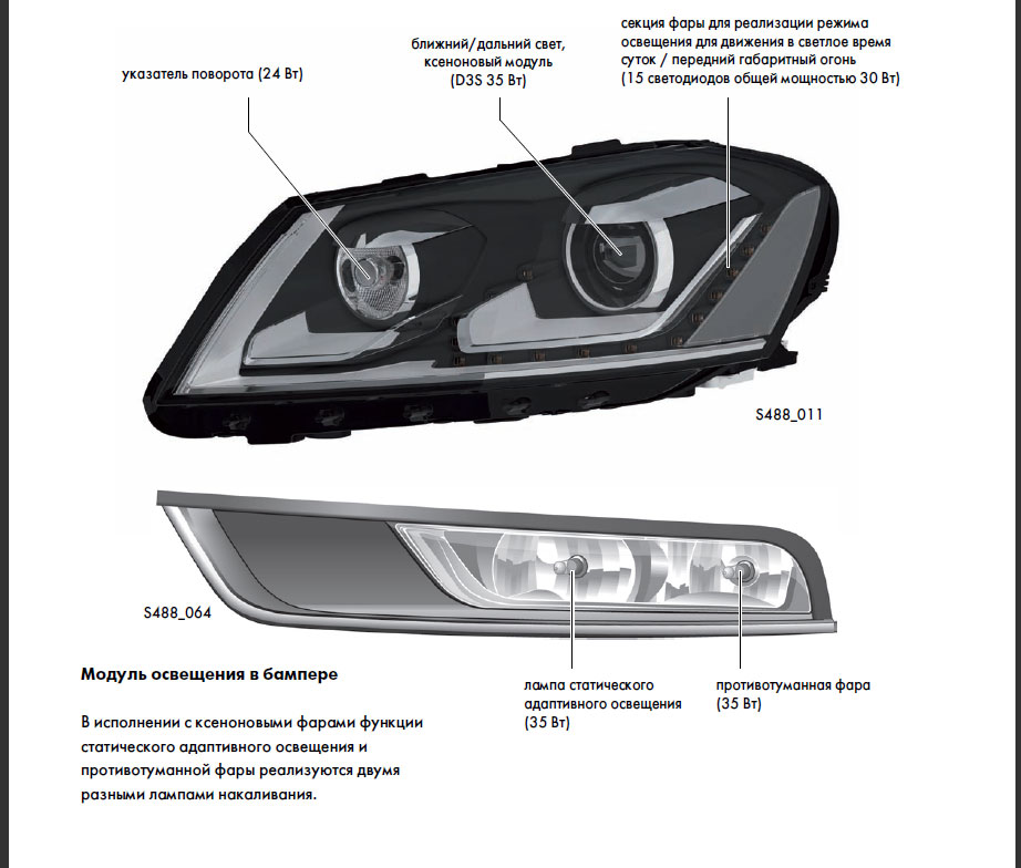 1. Ако основните фарове не са ксенони т.е. няма LED светлини тогава вътрешните секции работят като дневни светлини (крушка H8 21W х2), а външните секции (крушка H8 35W x2) се използват като фарове за мъгла и като статични светлини при завой в съответната посока