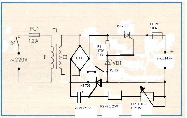 Здрасти,схемата с тиристора е добра,вече опуках два трафа,като не предвидих ограничение по ток и при първоначален заряд на разреден акумулатор трафа отдаде над 15А което не е проблем,проблем се оказа че държа 15А в продължение на 2 часа и издъхна....!При мен обаче напрежението по време на заряд достига 15,3-15,4 Волта.имам две различни зарядни ,с различни трафове,съответно едното ограничено по ток на 8А другото на 6А и двете подминават 15 Волта ......Това смятам че не е проблем ,стига да не преминава 15.5 и нагоре над 16 волта !Не ми се спори защо трябва да е така ,но смятам го за нормално !Напрежението след трафа и при двата е 17-18 Волта