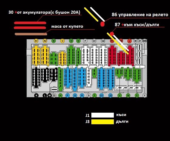 и малко идеи от руския форум и аз съм с релета.Ето така ги вързах аз,прерязах жълтия кабел(J3)за дългите и белия(J1)за късите малко преди да влязат в таблото.На изходите от таблото сложих мъжки кабелни обувки,а на прерязания кабел от ключа женски.(Ако се наложи просто ги свързвам и си е като от завода)Взех + от акумулатора с двоен многожилен кабел 2.5мм/2,като всеки с бушон 20А,и ги свързах с 30-то краче на релетата(едно за къси,едно за дълги)Маса взех от таралежа в ляво от таблото.На свободните изходи от таблото(тези с мъжките обувки)вързах крачета 87,а кабелите от ключа с крачета 86.Не съм пускал нова инсталация към фаровете,защото са двусекционни с една букса,и няма смисъл без да сменя кабелите в самия фар(поне според мен)Стана(почти)Plug and play.Имам си габарити,дългите си светят заедно с късите и всичко е вътре на сухо.Мислех си да ги вържа след ключа къси/дълги,но при Б4 късите(май)не минават през него,та за това така,отделно жълтия кабел излиза от черно-бял 10 сантиметра преди да влезе в таблото...-
