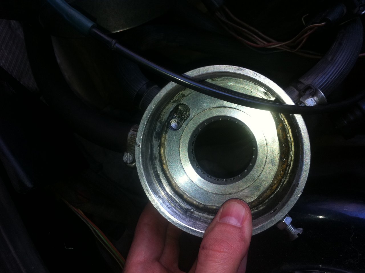 Повечето газаджии, или незнаят как работи тази инжекция или не искат да и променят стандартното състояние и затова слагат смеситела преди дебитомера за да не бъркат работата на бензин. Да, обаче пълно щастие няма! Искате да карате ефтино на газ, ще се наложи да направите компромис. Аз карам агресивно(може да се види по колата в гаража която карам сега, за щастие без газова, въпреки, че е трудно с тези цени на бензина) и за това доста често се случваше при този начин на каране да ми гърми. Причината е, че се запалва газта която се намира в тръбите м/у мотора и дебитомера, това е много газ и е опасна, клапите с/у гърмеж не са достатъчни за да поемат силата от детонацията и обикновено при мен имаше изкривяване на клапата на дебитомера или още по-лошо, направо се пръскаше с кутията. След това ми хрумна да оставям развита скобата на маркуча от към филтърната кутия и като гръмнеше маркуча изкача и само слизам пъхам го и продължавам. Това естествено не си е работа, карам в натоварено движение, гърми, спирам и отварям капака на средата на пътя. Знаех, че трябва да преместя смеситела на колектора и проблемите ще спрат, но всички газаджии твърдяха, че това е невъзможно. Да, ама не! Единствения проблем е степ мотора, който е бай-пас м/у тръбата от филтърната кутия и колектора. Разкарах го, запуших дупките, развих винтчето на дросела така, че той да остане леко отворен, за да може след като няма степ мотор да вкарва въздух за празния ход, от там да влиза този въздух. След това си го нагласих, при включени фарове оборотите да са около 900, аз климатик нямам, който има да го вкючи и него и да ги нагласи с него. Така карах доста време без никакви проблеми само на газ. Когато се кара само на газ, дебитомер не е нужен. Реших обаче, да накарам колата да работи и на бензин, единственото нещо беше да се нагласи колко натегната да е пружината на клапата на дебитомера от ето това черно зъбно колело.