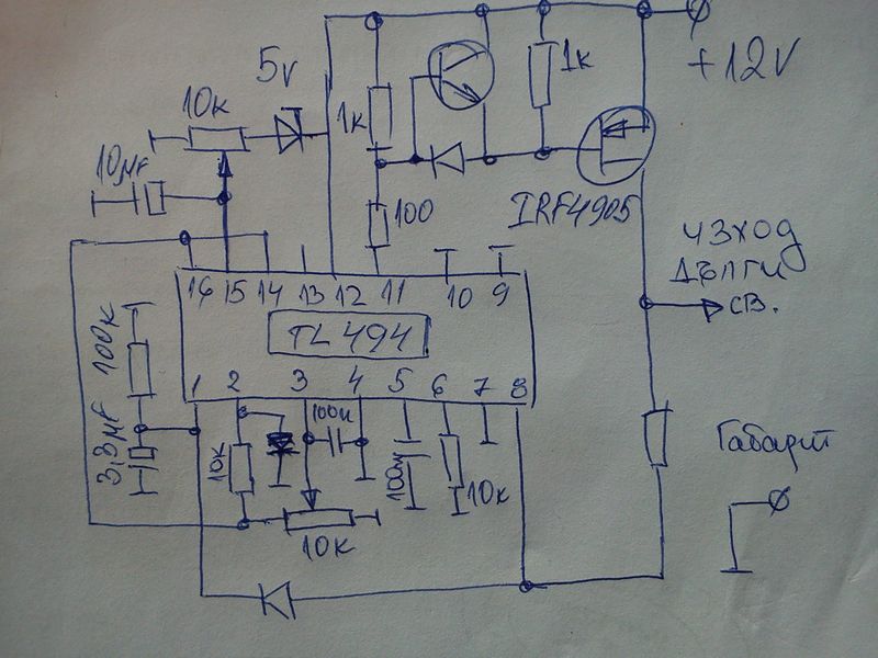 PS: Ей сега докато писах, ме озари идеята, че ако между 16 и 14 pin се тури един резистор примерно 47к, а от 16 към "маса" се поставят паралелно свързани резистор 300к и кондензатор 1000мF/5v , ще се "отключи" функцията coming home :idea: Обяснявам : Когато колата е на габарит, въпросният кондензатор ще се разреди през параленият му резистор 300к. При изключване на габарита , напрежението на пин 16 ще "клекне" с което ще "клекне" и прага за изключване на PWM-а за времето на зараждане на кондензатора през 47к. С две думи , при изключване на габарита , ДРЛ-а ще работи известно време, при напрежение на акумулатора по-ниско от 13.5V