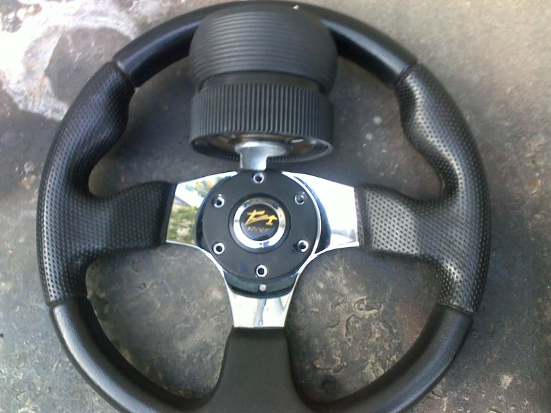 Имам си и спортен волан за трийспет лева. Временен. Подозирам, че е дал толкова много коне на двигателя, че за тва е изкривил главата.