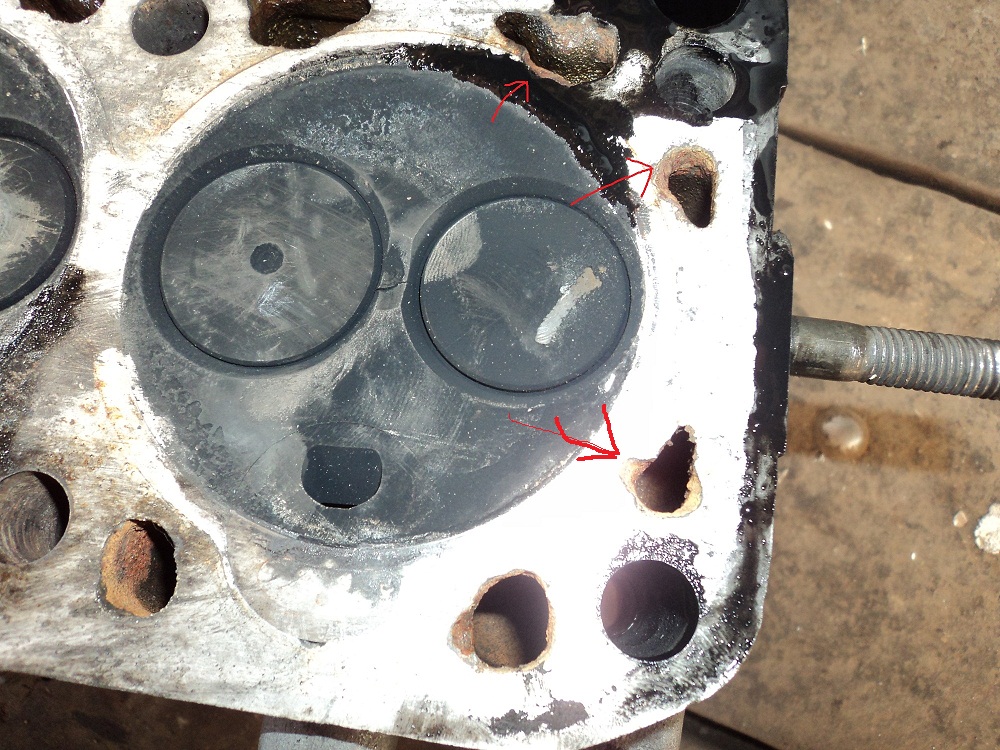 Не съм на място да я видя главата с очите си , но като нищо проблема може да се окаже гарнитура :!: И главата да е в ред, отсега нататък ползвай кач.антифриз , щом и топлообменника за дв.масло се е прецакал ( пробив от антифриза вероятно) , агресивен е бил и затова отворите за водата ( в главата), са на този хал!
