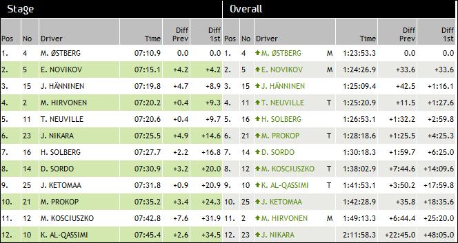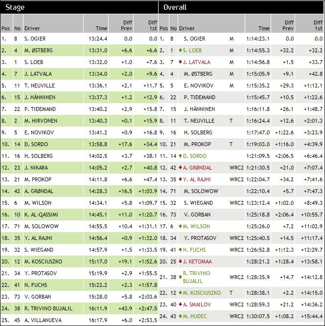 За сега води Остберг, Ожие и Латвала още не са стартирали, както и Хирвонен и Льоб.