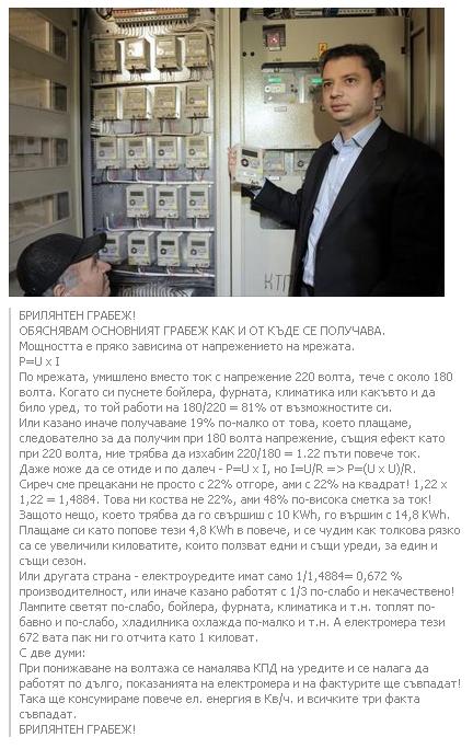 А я да си кажем сега ако ваш роднина ви се похвали че има човек в енергото дето "бъзва" електромера и вече отчита 30 процента от потребената енергия какво ще направите ?? Понеже аз мисля че мнозинството ще му кажат "давай го насам и да казва колко иска.." ! И това е само един от малкото възможни примери за всичко което става в държавата а после всички /включително и тия с пипнатите електромери/ реват как нямало такава държава. Някой беше казал една приказка за "лошия материал" в държавата и аз съм напълно съгласен с него ,че има прекалено много такъв материал а докато е така и господ да дойде не може да ни помогне !