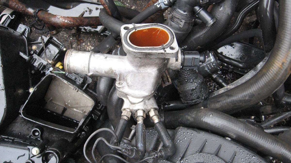 Това разклонение трябва да се замени с новия фланец, като ви е нужно и едно уплътнение с номер 037 121 688 , което се намира между блока и фланеца. Най-вероятно може да ви е нужно и едно уплътнение за датчик с номер N 903 168 02. След като се монтира новия фланец, маркучите се нареждат по почти същия начин, с едно изключение. Този който отива към парното трябва леко да се удължи и да влезе отстрани на фланеца (от към лявата гума на колата).