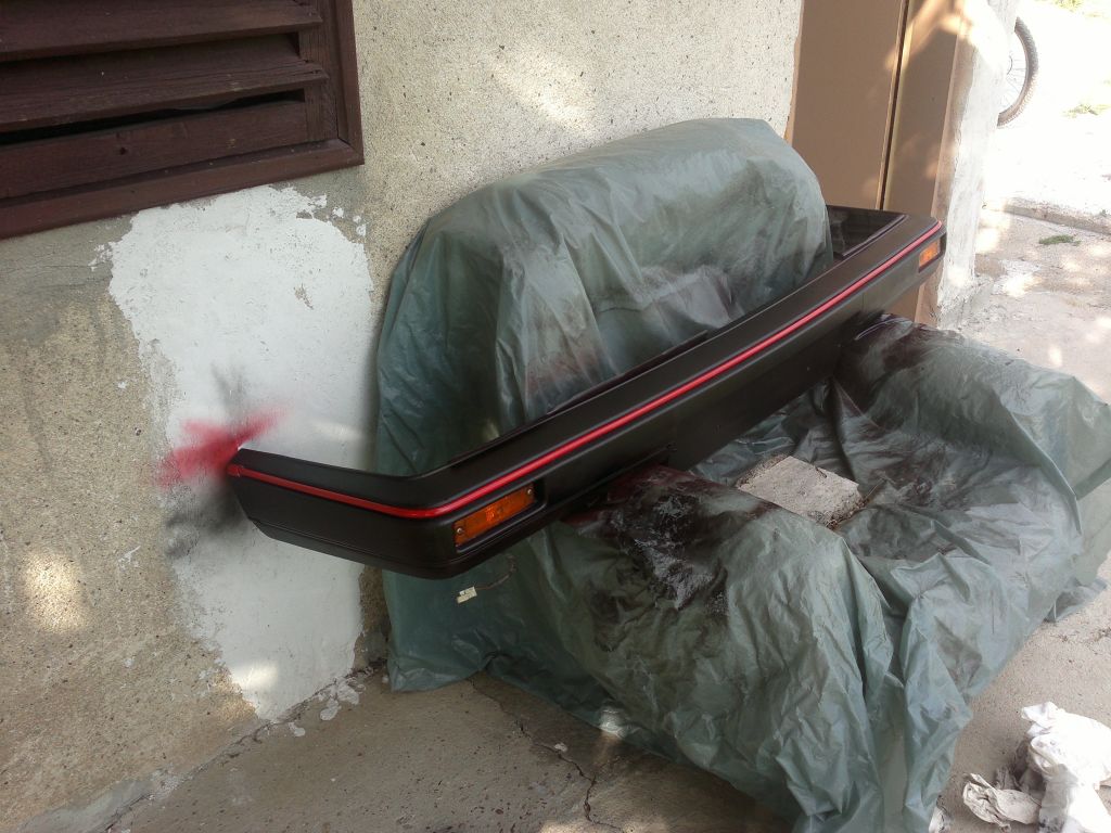 Докато голфа е в бокса и му се сменяме мотора , за него по нататък след Петък като го взема ще разкажа и ще дам снимки , реших да направя новата предна броня която купих да е готова за монтиране след взимането пак на голфчето , та първо я минах цялата с червен спрей за пластмаса , след това облепих бронята с хартиено тиксо и направих червения кант на GTI-то , на мен лично ефекта как стана доста ми харесаа
