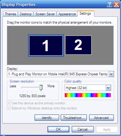 Специално заради теб извадих от скрина един лаптоп с XP и го вързах за плазмата. Моя с е интелска графика ама това в момента не е от значение защото иска да видим дали в десктоп настройките на уиндоуса се виждат 2-та монитора. Моя в момента е вързан за плазмата и показва това: