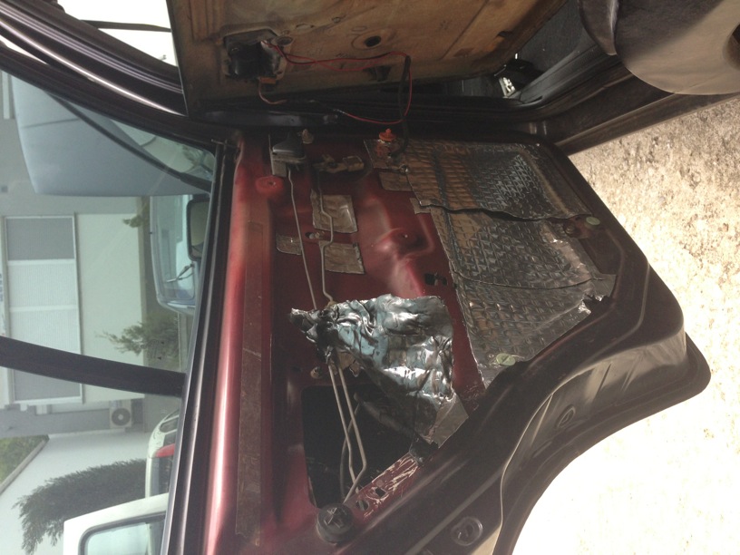 Следва процеса на шумоизолиране на автомобила. Първо по ред е шумоизолиране на багажника. 100 процентово, смея да твърдя, трислойно, от два различни видове материали и полиаретанова пяна, която набихме в отстрани. Ефектът при чукане по ламарините след пяната е все едно почукваш отлята от бетон стена. Ефектът след полагане на битумно-алуминиево термо-шимоизолационно покритие е ... страховита работа :)