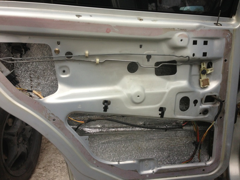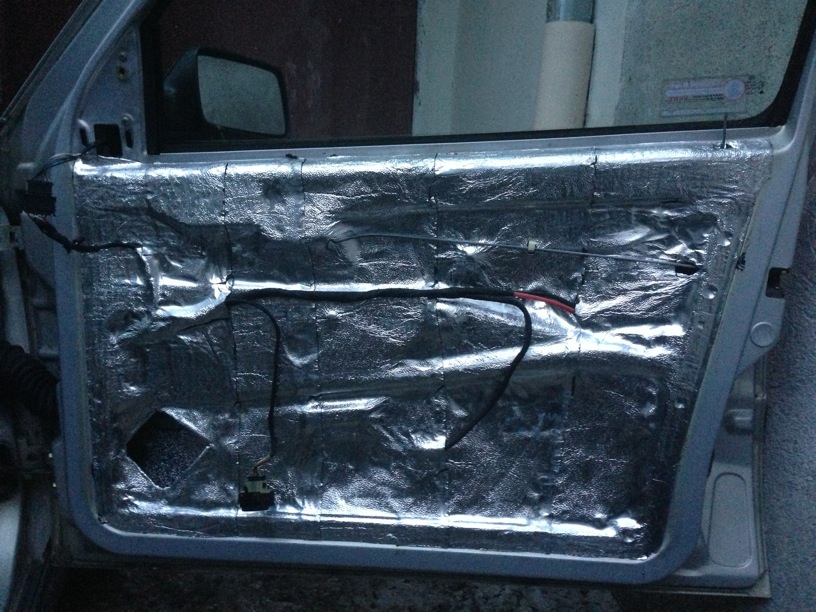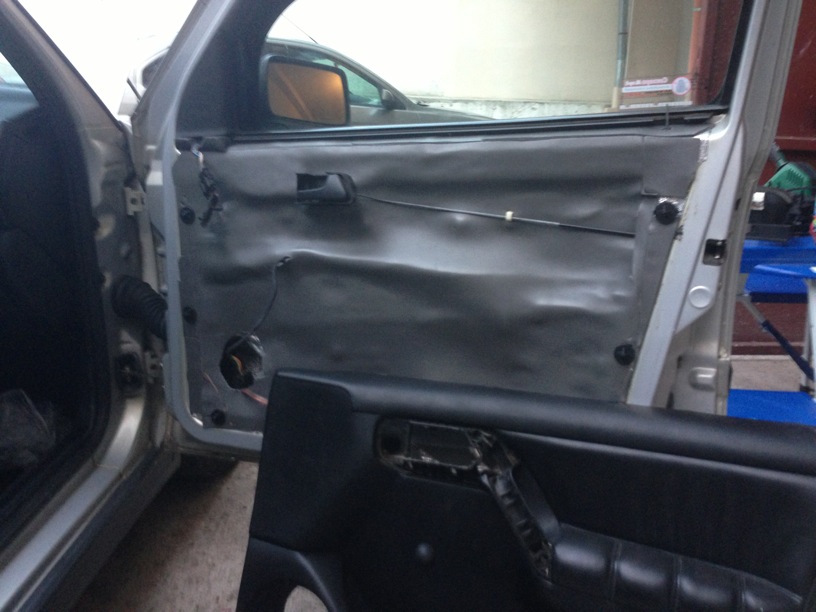 Един от най-важните моменти при шумоизолирането на автомобила са вратите. От там прониква огромно количество шум и ако не е правилно направено си е чист разход на време и материал. В този процес се постарахме да спазим всички възможни правила. Обезшумяването е трислойно, от два различни вида материали. Битумно-алуминиевия материал не е професионален и с малко под половин милиметър по-тънък от професионалните материали. Компенсирали сме със застъпване на материала при полагането му: