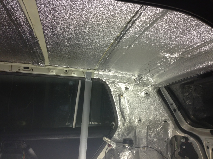 Таванът е едно от най-чувствителните места при шумоизолирането. Първо от там прониква много шум. Освен това от там прониква и много студ или жега според сезона. Шумоузолационният материал има и термозиолационни свойства. И тук се презастраховахме - застъпващи се битумно-алуминиеви панели и онзи материал на СТП, който одрах от стария голф като финиш. Крайният ефект е ... един път, да речем.
