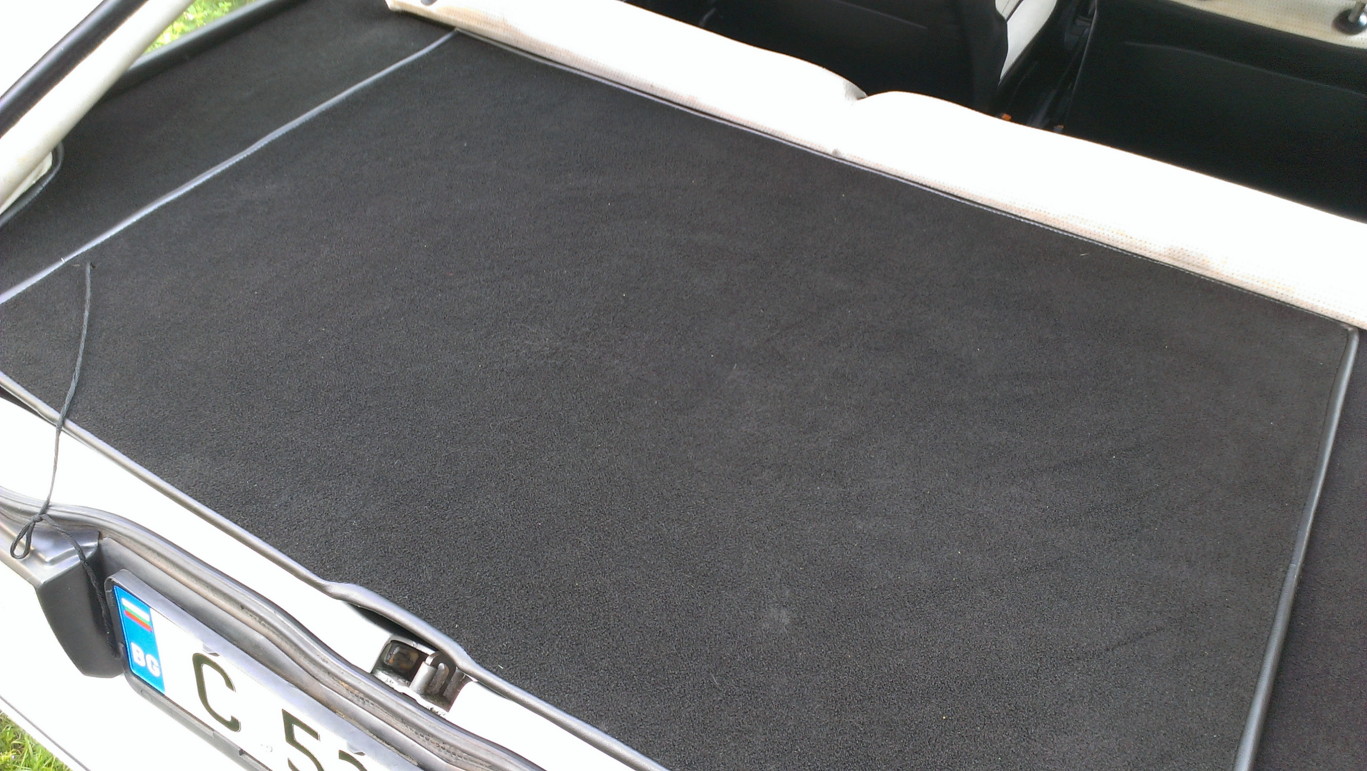 Тапицирах всичко и кората и страничните греди и пода с готин фин черен авто-мокет. Оригинално е пак черен, но малко по груб като за пода в хола.