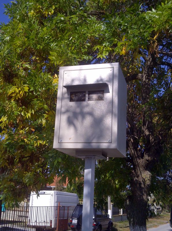 По-добре късно, отколкото никога - ето ги и ел. таблата - камери. Само забележете каква стойка имат - кух квадрат..... Приличат на къща за птички и са празни. Плашила!