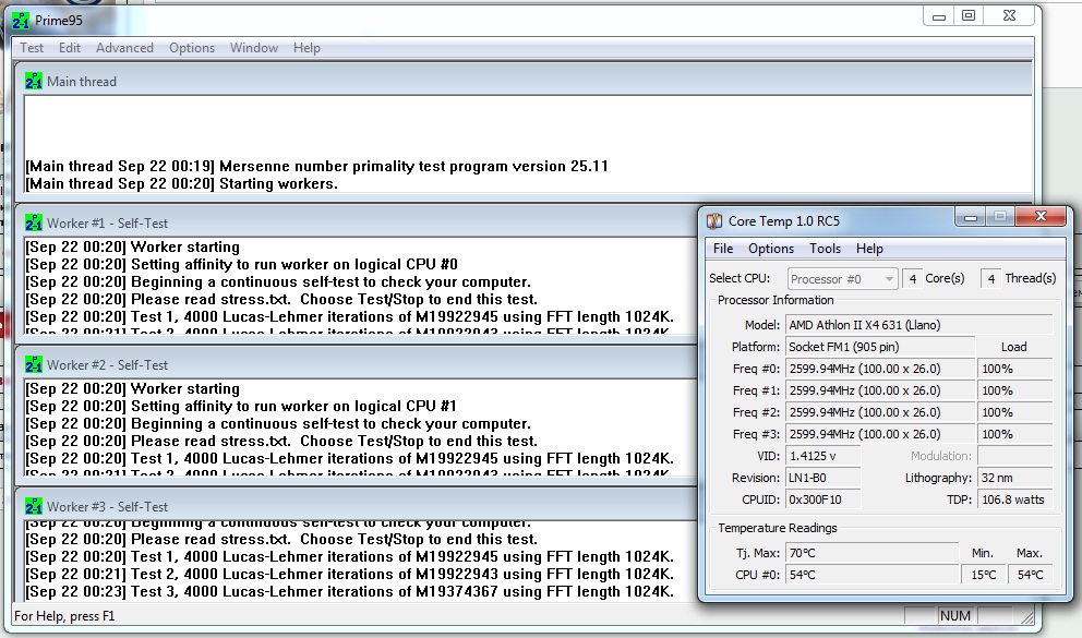Направих тест с програмата Prime95 - Под нея избрах "In-place large FFTs", което натовари процесора на 100%, както се вижда. Резултатът след няколко минути постепенно покачване до 54 градуса и после падна на 53.