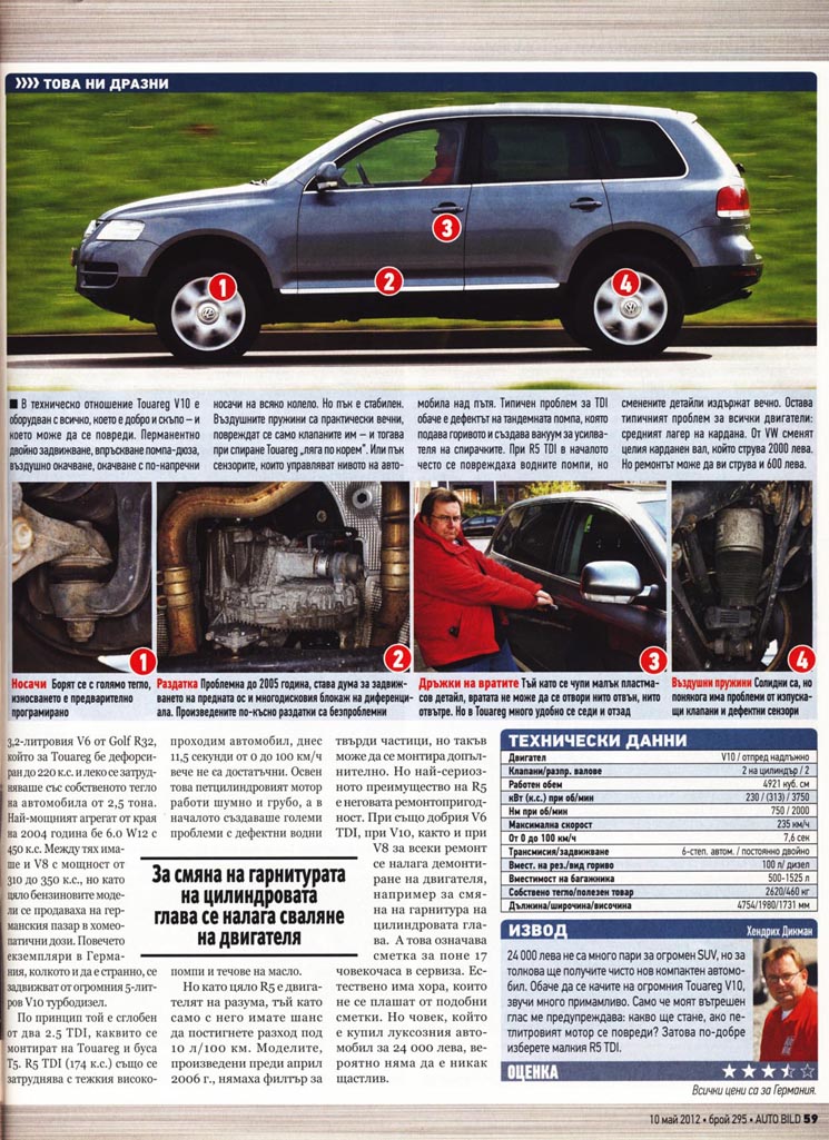 Качвам една статия от AutoBild (10 май 2012) за употребяван Туарег, има ценни неща вътре. Например, R5 е с най-добра ремонтопригодност, докато при V6, V8 и V10 за всеки ремонт се налага демонтиране на двигателя (напр. за смяна на гарнитура на главата). Също важно - въздушните пружини са практически вечни, повреждат се само клапаните и сензорите.