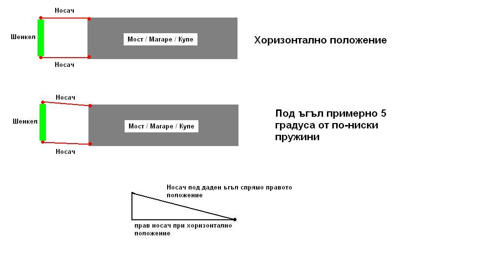 Сега, както е известно на всички, хипотенузата в този образен триъгълник, трябва да е най-дългата му страна и колко е дълга, зависи от ъгъла с катета (в случая ни това е долния носач, който е прав първоначално). Да ама в нашия случай хипотенузата си е самия носач, който е и хоризонтален в предния момент от време т.е. има една и съща дължина (не е разтегателен) и елементарното заключение е, че хипотенузата на този триъгълник няма да е толкова дълга,колкото съм я нарисувал и тогава излиза, че нашия шенкел ще отиде по-навътре от предишното си положение заедно с другите носачи (за които важи същото нещо) и заедно с кормилния накрайник (за който пак важи същото). Предвид, че вътрешните накрайници не са винаги едни и същи и имат производствени толеранси, а ментетата нямат въобще никакви толеранси, не винаги ябълката на вътрешния накрайник съвпада с точката на изместване на окачването от носачите и тогава при различно положение на шенкела (т.е. различна височина на колата), се получава макар и малка разлика в сходимостта на двете предни колела, заради което не е лошо след окончателното спускане на колата (или вдигането и), да се направи въпросния реглаж, за който спорим. :mhihi