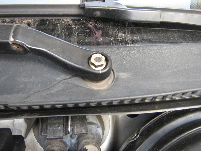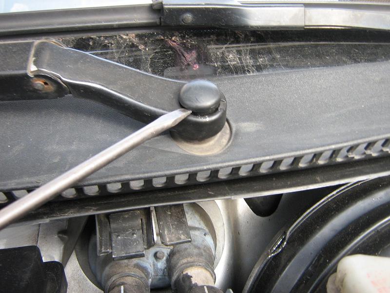 2. Демонтираме рамената на чистачките. Изваждаме тапите, които крият гайките, развиваме гайките с гедоре или глух ключ 13мм. Рамената излизат с леко поклащани е дърпане на горе.